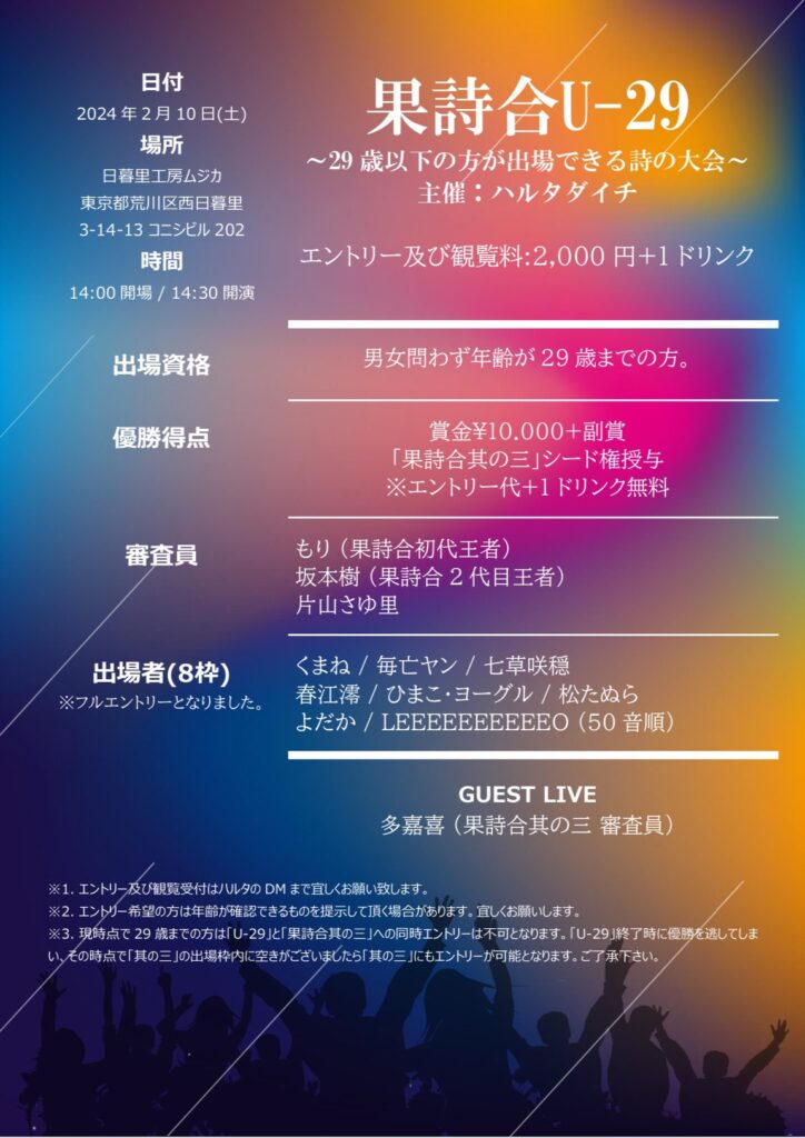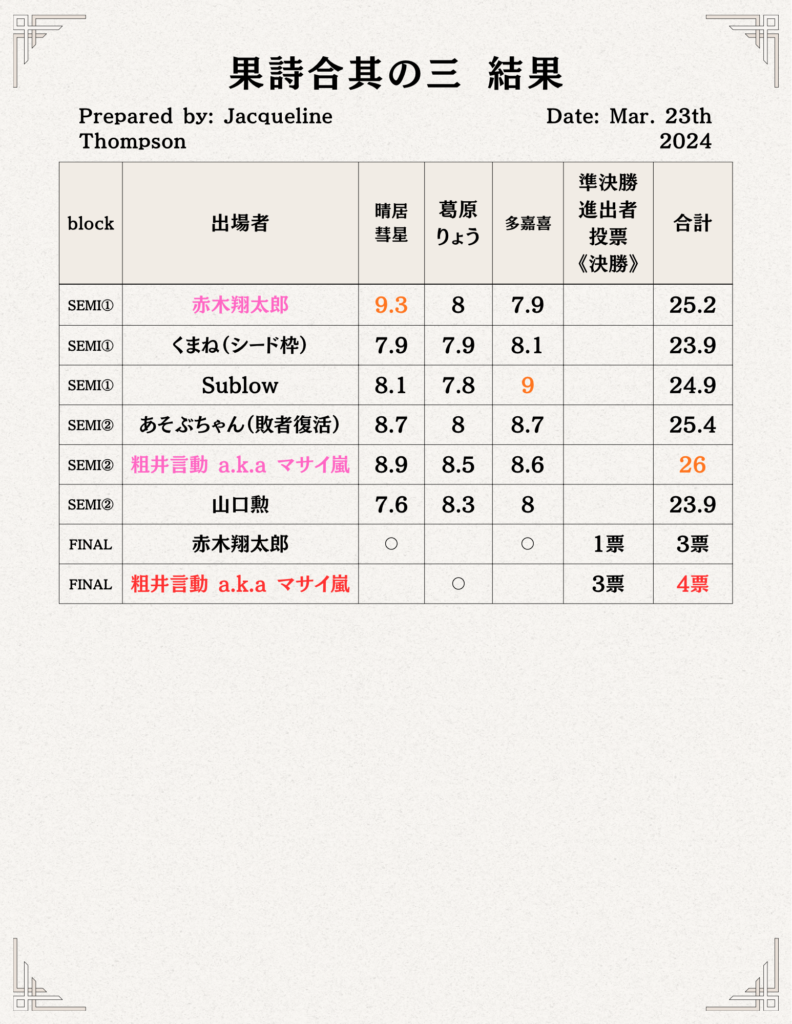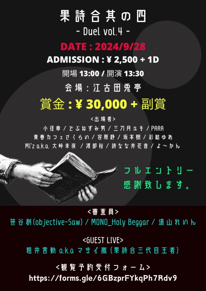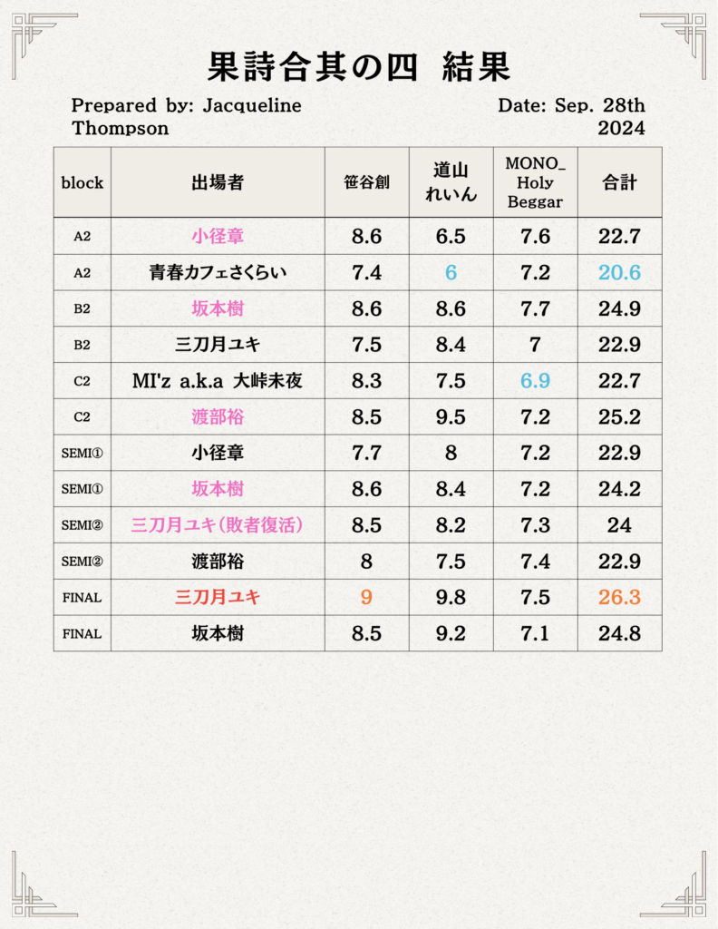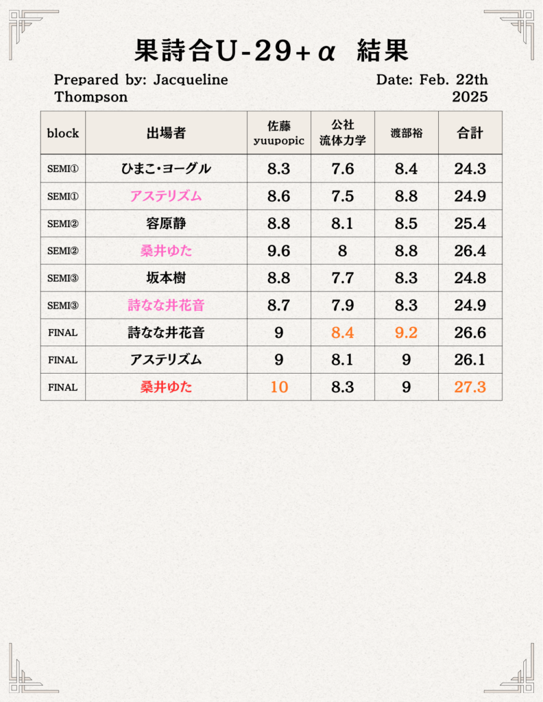 なお、結果発表後には各審査員から講評を頂ける時間もあり、これが果詩合という大会における最大の特徴となっております。基本的に審査員のメンバーは大会毎によって変わりますが、詩人の方以外にもラッパー、舞踏家、スタンダップコメディアンなど毎回様々なジャンルの方をお招きしています。これには様々な「表現」に携わっている方に評価して貰う事によって大会の奥行きを広げていく、という目的もございます。また回によっては果詩合の歴代優勝者の方を審査員にお招きする事もございます。