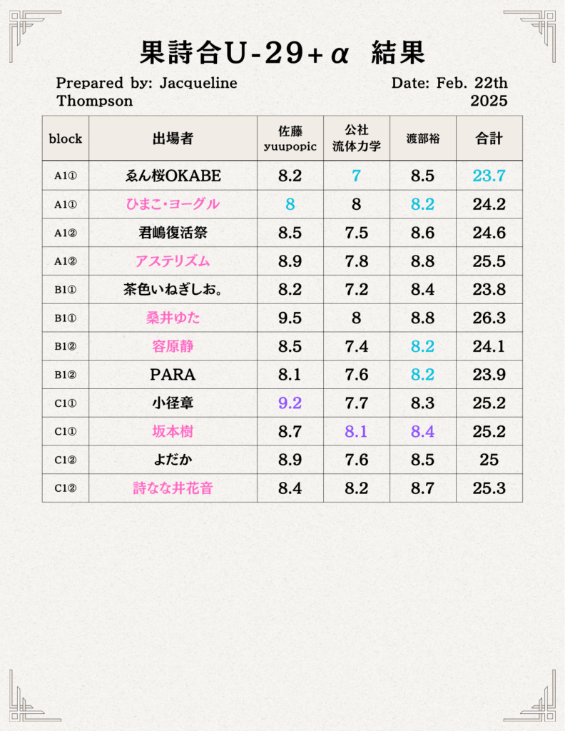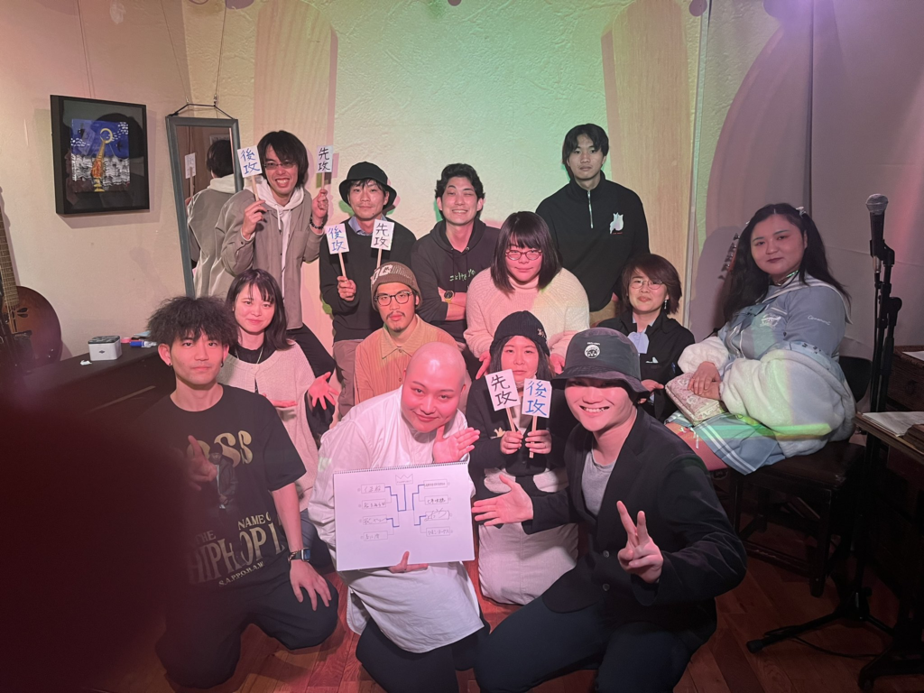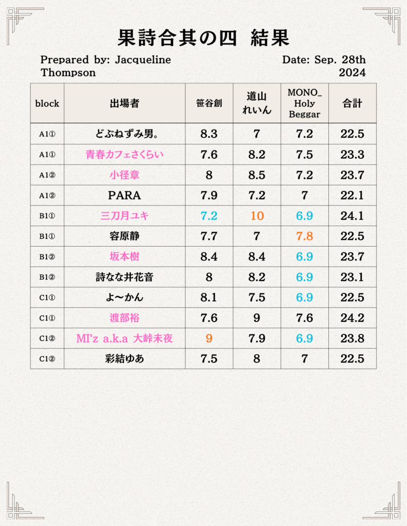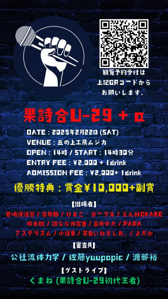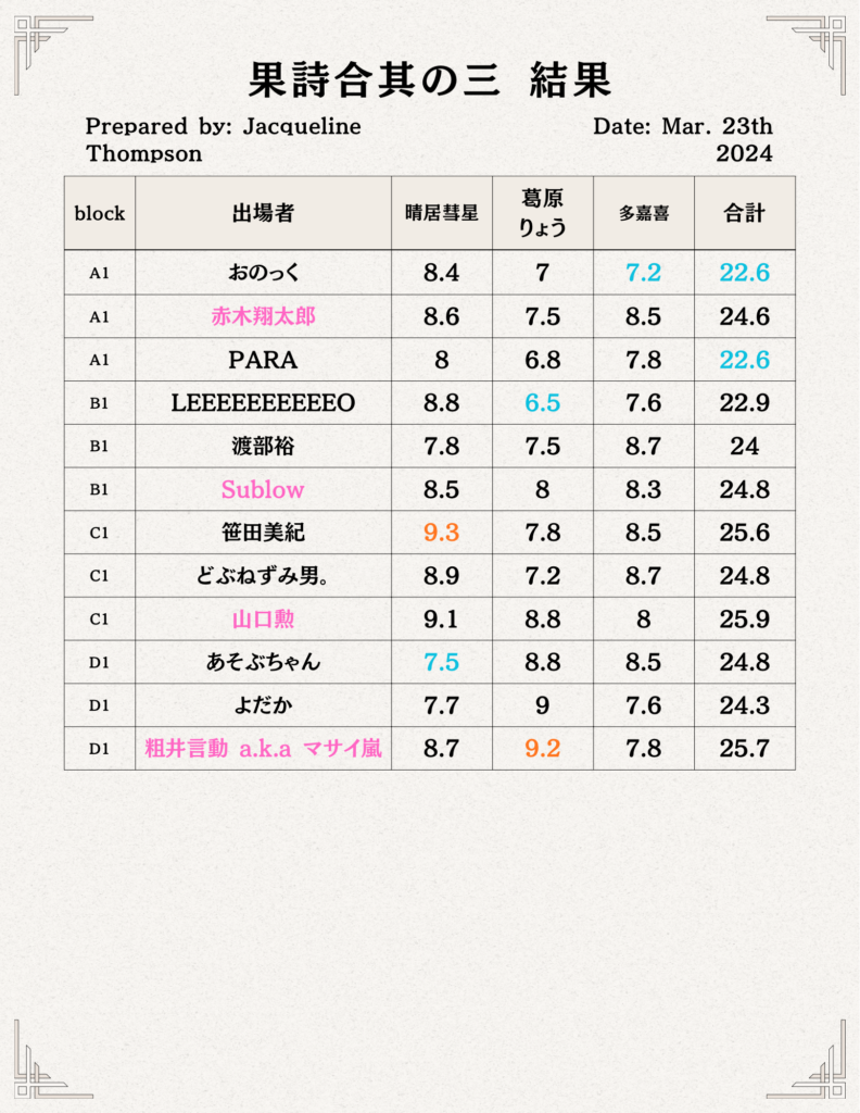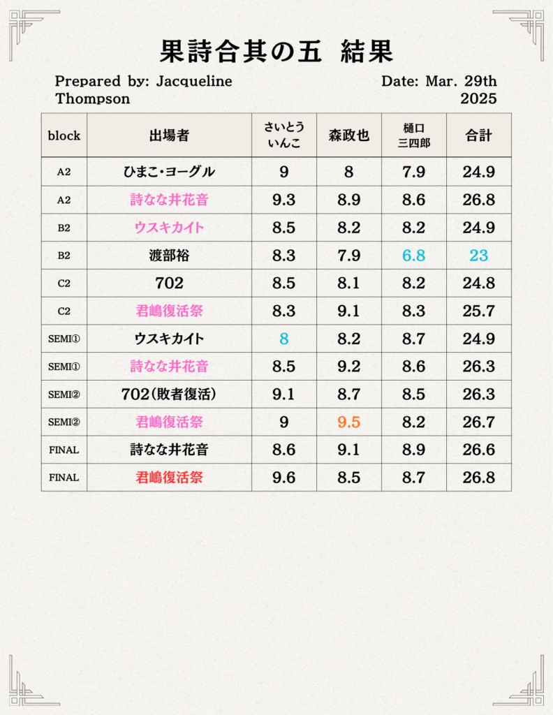 なお、結果発表後には各審査員から講評を頂ける時間もあり、これが果詩合という大会における最大の特徴となっております。基本的に審査員のメンバーは大会毎によって変わりますが、詩人の方以外にもラッパー、舞踏家、スタンダップコメディアンなど毎回様々なジャンルの方をお招きしています。これには様々な「表現」に携わっている方に評価して貰う事によって大会の奥行きを広げていく、という目的もございます。また回によっては果詩合の歴代優勝者の方を審査員にお招きする事もございます。
