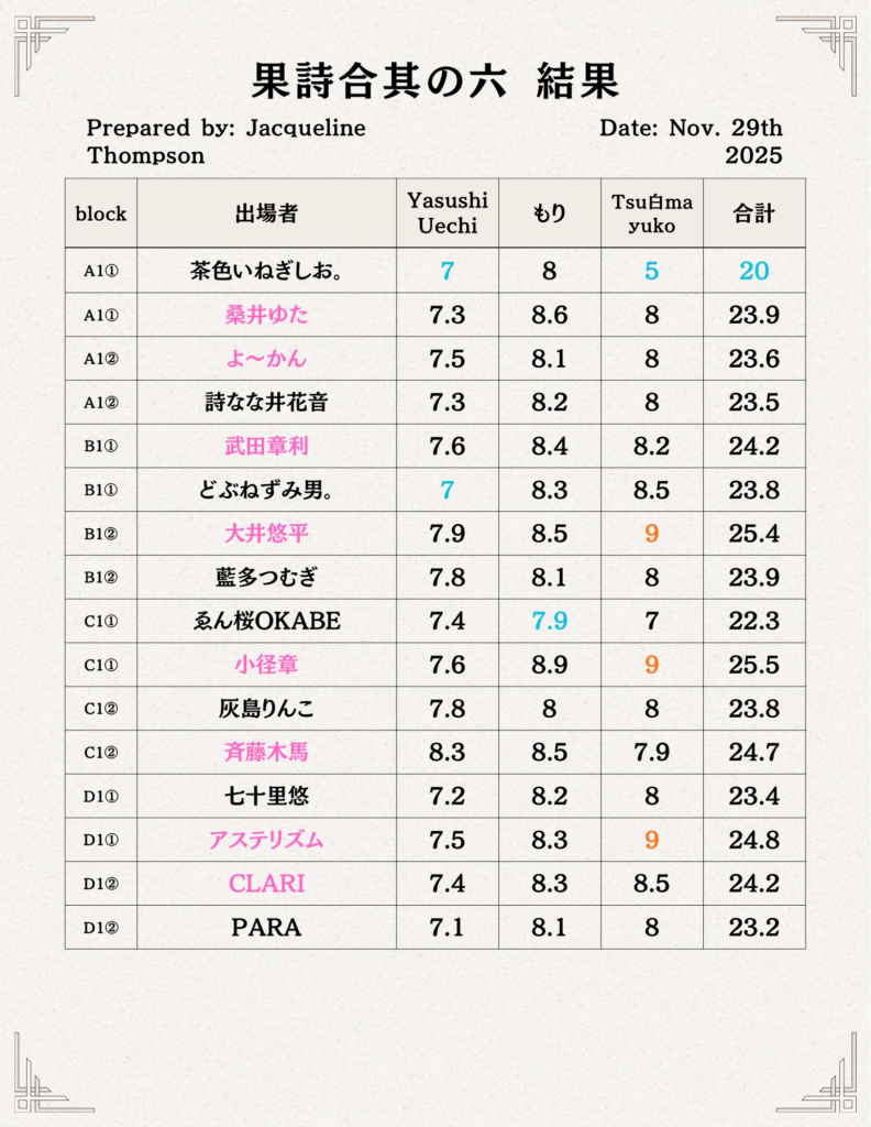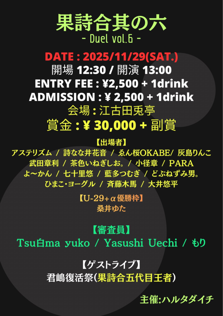 20251129果詩合vol.6@江古田兎亭。スラムイベントとの付き合い基点で今年は色々あった、俺としてはこれが締めになるかな。きっかけの終着たるものが幾つも有って表現はもうがっつかずに余生で良いと悟りに近い想いが過ってる。人が成すイベントの人人同士の考えがあってベクトルが様々な方に向いてる訳で中には人のベクトル曲げようとする人も居てそんな様子を拝見したり当事者だったりしてエネルギーを使うもんでして、その状況乍ら上手く対応出来たなと感じる俺の中では。最近で心よせてる方が苦境に晒されてそれ込めて当日さらりテキスト描こうと思ったのだがこのイベントにかけての内容になったしまったかな、前日に初戦の最後の出番と決まったので皆んなのパフォーマンス伺ってからになるし、まあ沢山の人をテキストに詰めたつもり。ちょっとしたハプニングもあり表現魅力的なくらにゃんとの対戦になったのが先ず嬉しかった、ステージは生物で面白い、自分のパフォーマンススタイルがああなるの予測出来なかったからね、時間切れで全て詠み切れなかったけど充分に満足だった。果詩合に於いて初戦敗退記録をまた一つ伸ばしたけれど実は長年やってる中で採点制一度も勝利してないんだよな、採点どうぞと言われてその点が出る前に負けたなと過ってその通りになってしまうんだよな。生きてる内に打破出来るかな、小さな目標にしようかな。