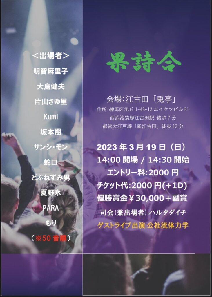 20230319 #果詩合 @江古田兎亭。とてつもない面子が集まった…皆何かすら抱えてる、最近のスラム採点てのはパフォーマンスの比較よりも人自身の魅力に疾る傾向がある様に見られる、勿論評価基準の一なれど。蛇口さんに言葉の恐ろしさを感じる、恐らく過去詩ではあるものの諸刃の剣であり、間違いなく己の身体も傷付け蝕むみたいな。俺も過去やっていた気がする、傷み忘れさせる様にアルコールや肉欲の快感に逃げていた気がする。言葉の中で保護治癒するのも詩かも知れぬ。