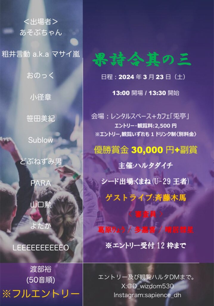 20240323果詩合其ノ三@兎亭。スラムはナマモノでフタを開けないとどう言う方向性になるか分からない、パフォーマーは観客所謂場で為される物である事を痛感させられる、必勝法があるとしたらその空気が察知できる事になるんだろけど、まだそれに至らないのは悔しいかな。加えると察知してそれが出来る人、それを意識で出来るのは相当なもんだ、故になかなか勝てるもんでない、事実優勝者は一人だもんね。と言う事で当日エントリーの赤木さんの大活躍と粗井君のハイクオリティで安定したスタイルが今回の空気でした。エントリー者全員各々のパフォーマンススタイルがそれぞれあって面白かった、今後も記憶ぶり返しそう、因みに自分当イベント唯一皆勤出場になってしまった、次回勝つの目標にするか、それとよだか君は期待を裏切らない男である、サイドストーリー的には伝説級だ、主人公になれぬのは皮肉にもよだか、だからかも知れない。愛されるべきキャラとも言える。