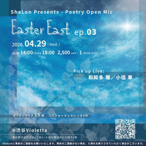 Easter Eastは4/29、5/16にも渋谷Violettaで開催予定となっております。今のポエトリーシーンにおいて、大変瑞々しい空気を味わえる素敵なイベントなので、皆様是非お越し下さい。